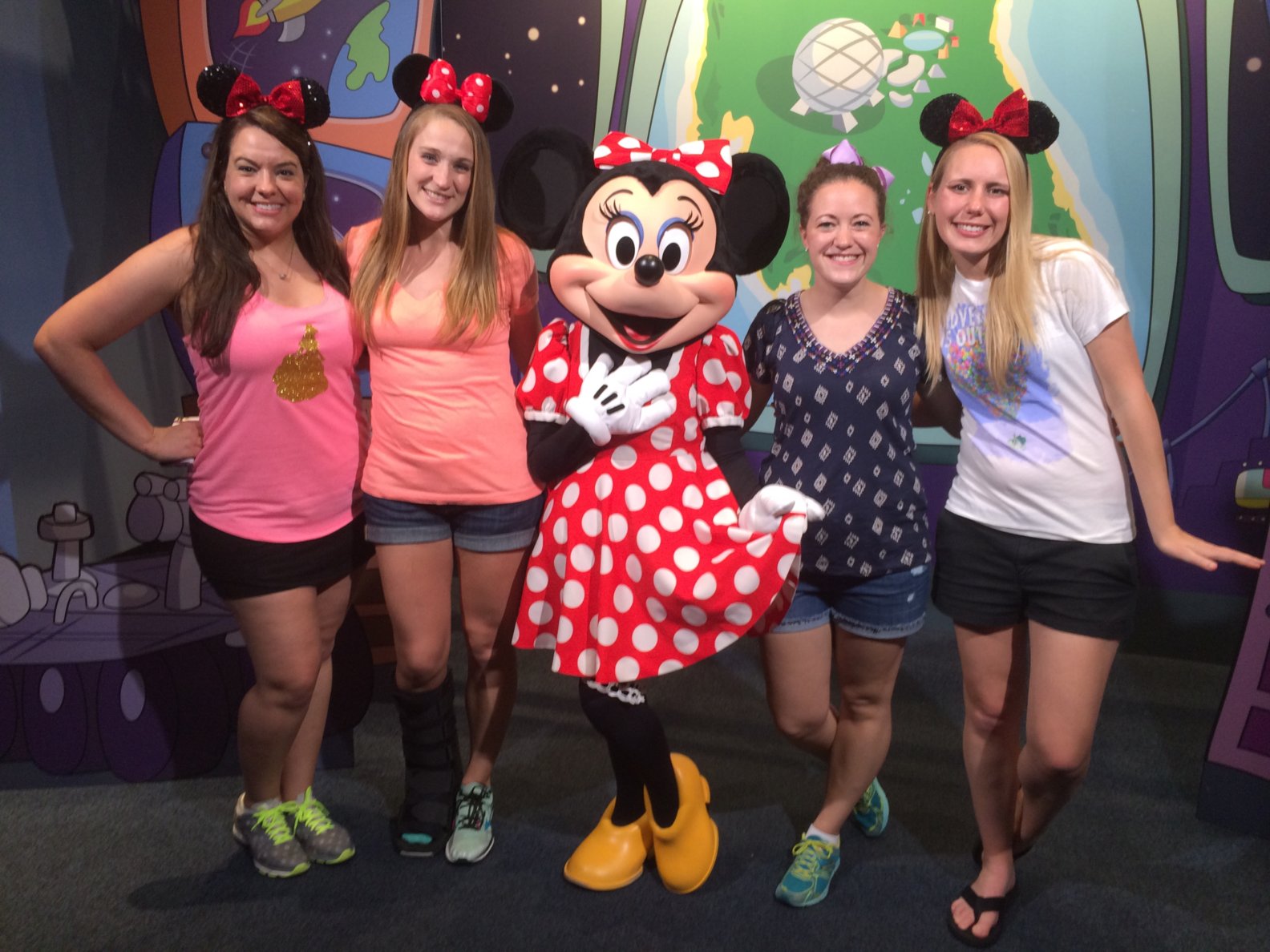 2015 was an interesting year! We had the same crew as the year before plus a tiny addition…fetus baby Chloe. I didn’t know that she was a girl yet at 17 weeks pregnant. I also managed to tear every ligament in my ankle just days before we left for Disney. I was planning to run the 5K and the Glass Slipper Challenge for the first time! Instead, I walked the 5K, skipped the 10K and participated in the first 3 miles of the half marathon before pulling over to a medical tent and waiting for the van to pick me up. We still played at all the parks and my girls ended up pushing me around in a wheelchair.
